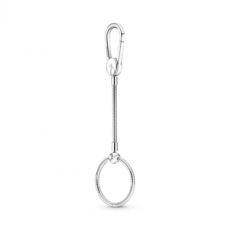 Sterling silver bag charm holder with long snake chain and medium Pandora O pendant