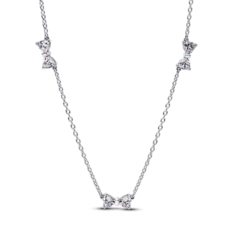 Bow sterling silver station chain necklace with clear cubic zirconia and sliding clasp