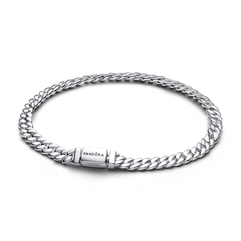 Стильный и современный браслет‑цепочка в кубинском стиле из стерлингового серебра 925 пробы с блестящей полированной поверхностью и элегантной застёжкой с логотипом Pandora. Он представляет собой универсальный аксессуар, который гармонично вписывается как в повседневные образы, так и в более нарядные ансамбли.