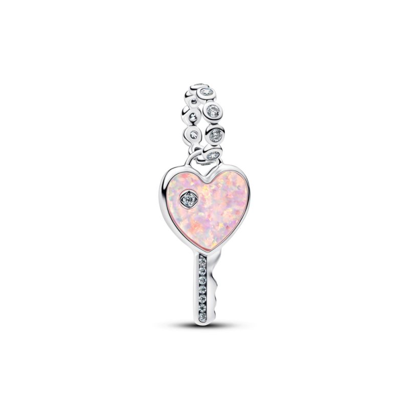 Heart key sterling silver dangle with clear cubic zirconia and lab-created pink opal