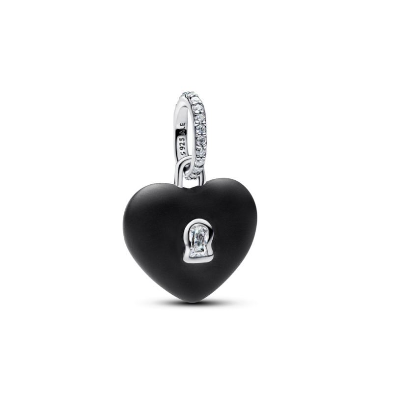 Декоративный подвес‑шарм в форме сложенного под замок сердца, выполненный из стерлингового серебра 925 пробы с матово‑чёрной керамической вставкой в форме сердца. Шарм украшен прозрачными кубическими циркониями и декоративным элементом в виде камня в форме «ключевого отверстия», а на металлической пластине выбит гравированный текст “YOURS” — что символизирует любовь, которую хочется хранить под замком.