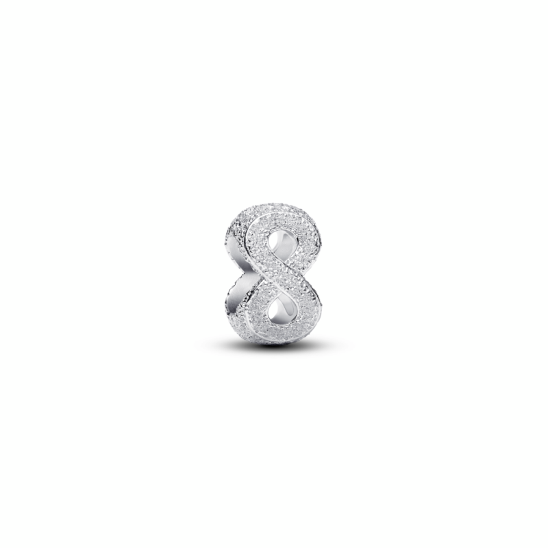 Дизайн: символ бесконечности (∞) с текстурированной поверхностью, напоминающей мелкую ромбовидную структуру, что придаёт шарму глубину и игру света.